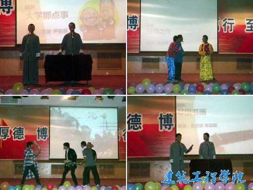 比赛在许乐振、于松北带来的快板《绕口令》中拉开帷幕,流利的口才、经典的段子瞬间将观众拉入曲艺的氛围之中。接下来的相声《大学那点事》用幽默诙谐的语言向大家描绘了老员工的生活、爱情、就业等方面的场景,引来了现场的阵阵欢声笑语。《经典之作》则用通俗、动感、伤悲、苦中作乐等基调演绎了经典小品《杨白劳》,笑料不断,惊喜连连。在回味经典的同时,《魔术传奇》给观众带来了一场别样的视觉冲击。《乌江风云》借助了一些时事潮语、流行歌串烧,配以搞笑滑稽的动作,为观众献上了一段现代版的《鸿门宴》。校园著名曲艺爱好者苏世忠、张磊磊带来的对口响声《琴棋书画》语言诙谐,谈吐幽默,彰显了在校老员工的曲艺水平。比赛最后,女主持人为大家演唱了一曲经典动听的歌声《追梦人》。