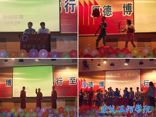 晚会在逄澍、尹名荻精彩的相声《大学那点事》中拉开序幕,相声以诙谐幽默的手法讲述了大学里的感情、就业和生活,笑料不断,惊喜连连。接下来由于松北带来的经典段子《绕口令》让观众们再次领略了他流利的口才,娴熟的表演。接着由淄博曲艺家协会夏雨等演员带来的《报菜名》则以别样的形式展示了曲艺爱好者们的嘴上功夫。接下来由苏世忠、沈峰带来的新段子《新闻联播》更是突破传统曲艺形式,以幽默搞笑、诙谐滑稽的语言播报校园新闻和社会新闻,让观众在娱乐的同时联系了现实问题,现场叫好声不断,使晚会达到高潮。接下来由朱红斌、刘纪超带来的《爱在囧途》讲述了他们对爱情的向往以及他们曲折的寻爱旅程,给观众带来了不一样的精彩。亓益明、巩庆亚的《穿越》则有强烈的文化气息,历史与曲艺的结合堪称完美,使观众见识了曲艺爱好者们的文化功底。于松北、王乃江、杨瑞霞的《牛郎织女》更是打破传统,以东北二人转的形式演绎了浪漫的传奇爱情故事,让观众们欣赏了不一样的二人转和不一样的牛郎织女。马兆腾、张坤的《我的老员工活》则以一个大学毕业生的口吻讲述了一个颓废的老员工浑浑噩噩的老员工活经历,发人深醒,给人启迪,激励我们要好好学习,珍惜青春,过有意义的生活,丰富自己的人生之路。晚会在日新全体人员的演唱中圆满结束。
