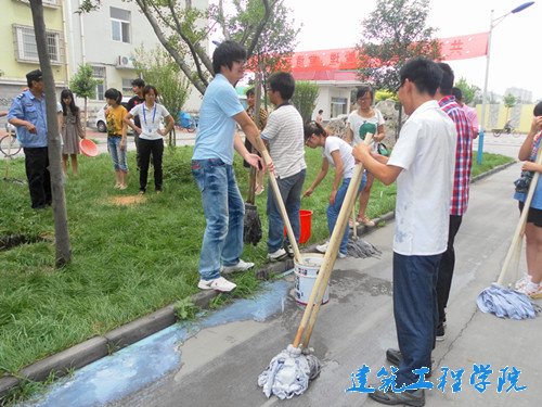 上午九点同学们步行来到金鑫园小区,金鑫园的负责人对同学们义务劳动的行为表示赞扬,并鼓励大家积极参加社会实践,将理论付诸于实践,逐步感悟做人做事的道理。随后,负责人介绍和分配了本次社会实践的任务,本次活动的内容是志愿者分组对小区的九个单元打扫卫生。领到拖把、水桶等卫生工具后,同学们便分头开始行动。提水、拖地,每个同学认真努力地打扫着自己负责的区域,经过一个多小时的努力,社区环境有了明显改观,活动的开展受到了社区居民的一致好评。