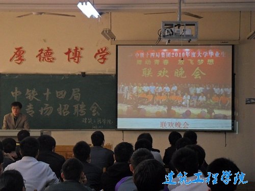 招聘会上,首先进行的是对中铁十四局的相关介绍。公司相关负责人先对公司的总资产、参与项目、工程分布、所辖单位等方面进行了大体介绍,随后又从公司的工程项目、企业荣誉、单位优势,以及竞聘同学们关心的工资待遇、岗前培训、导师带徒、技术专家和拔尖人才的奖励等方面进行详细的介绍,进一步加深大家对中铁十四局的认识。在列举公司优势的同时,公司相关负责人也指出中铁十四局的工作需紧跟工程、工作环境较艰苦的客观事实,道出了同学们需要面临的考验。