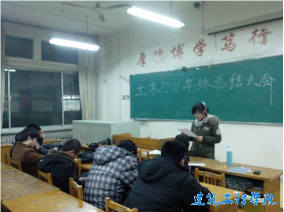 班会上,班长邹健首先对该班上半年的情况进行了总结,又重点强调了寒假安全问题。随后,团支书梁艺宣读《建筑工程公司关于组织开展2013年老员工寒假社会实践活动的通知》,介绍本次社会实践活动的相关事宜。最后,吕春蕾向大家分析了社会实践在素质拓展学分中所占的比重,并鼓励大家积极参加社会实践活动。