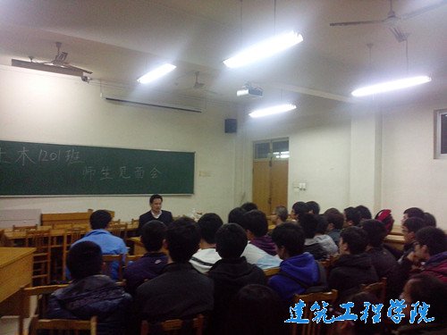 4月22日晚,土木1201班在12号教学楼楼304教室举行师生见面会,建筑工程公司副经理贾志荣受邀到场,与同学们,土木1201班全体同学进行亲切交流。