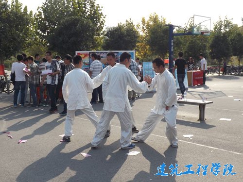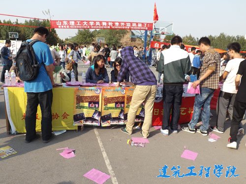 通过发放宣传单页、悬挂条幅等方式,各个社团向员工们展示了独特的魅力。建工之家社团制作的模型造型奇异,吸引了同学们的注意,引起了员工们对建筑的浓厚兴趣。以传递爱心为宗旨的微尘志愿者协会,发扬关爱他人、奉献爱心的精神,汇集了一大批有爱心、有责任感的同学。微尘的奉献精神鼓舞了一代代山东理工大学学子。梦想家乡文艺艺术协会、日新曲艺社、太极拳协会、飓风球迷协会这四个社团也凭借着各自特色,为纳新活动增添了一抹精彩。劲爆的舞蹈瞬间点燃了活动的气氛,梦想家乡文化艺术协会的的精彩表演吸引了无数的同学。日新曲艺社的相声、小品诙谐幽默,戏曲唱腔优美动人,快板技艺高超,无不向同学们展现了传统文化的风采。刚柔并济的太极拳打出了中华五千多年的武术精髓,火热的足球表演将年轻人的活力展现的淋漓尽致。