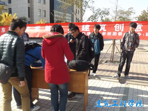 建筑不仅是静态的艺术,更是生命的活力与张扬,承载了无数人的梦想。为使同学们亲自动手参与建筑模型的制作,构建心中的梦想家园,11月7日,由校团委主办,建工之家社团承办的“山东理工大学建筑创意大赛”活动的宣传,在各餐厅门口火热开展。
