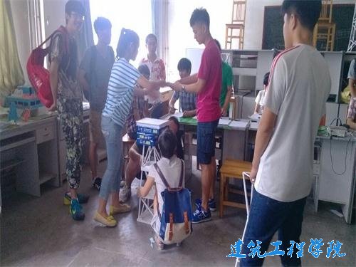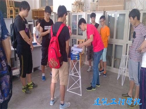 每位参赛队员都面露喜色,他们搭建的结构清晰合理。设计的结构都各具特色,有的结构牢固,有的外形美观,有的构思新颖,有的重量轻巧。各组参赛团队都陆续带着自己的作品来到结构实验室,先进行每件创意品的称重,接着进行最终的考验——加载试验。在加载过程中,选手们的创意品酣然不动,迎来了围观者的热烈掌声。