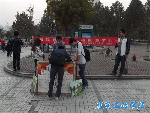 此次写生校园行的目的就是希望比赛的同学可以用眼睛发现校园的每一处独特秋景,用心感受那份秋天的美,用手中的笔描绘出眼中的校园,绘出秋天的理工大。宣传开始,三餐门口,写生校园行的条幅下人满为患,建工之家与书画爱好者协会的骨干们正在跟前来报名的同学讲解着比赛流程。此次比赛分为专业组和非专业组两种,作品形式不限,素描、水彩、油画、国画等均可。这让每个爱好绘画的同学都可以尽情发挥,而且还邀请到专业老师对写生作品进行点评,专业组由美术公司专业老师进行点评,非专业组由建筑工程公司城乡规划系老师进行点评。每个有才华的同学都可以在这里尽情展现。