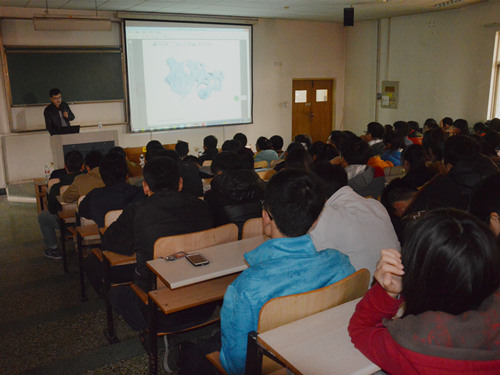 会议在田兆富的开场致辞中展开,贾新经理首先发表了讲话。他全面地讲解了当前创业的情况并简单介绍了点云公司运用的三维激光扫描技术。在分享了其创业经历后送给同学们十六字箴言——人定胜天、化敌为友、致力为公、修身齐家。之后,在同学们热烈的掌声中,李晓龙经理为同学们具体展开三维激光扫描技术运用的介绍,从“无人机在大地面积地形测绘中的应用“到“在蓝色新区土石方计算中的应用”再到“在古建筑精细测绘中的应用”,独特的技术应用极大地引起了同学们的兴趣。此外,李经理为我们现场演示三维激光技术扫描仪的工作原理。最后,亲身参加过公司实习的应届毕业生李成辉与同学们分享了在公司里实习的所见所闻。为了让同学们进一步的了解当今的创业情况,李晓龙经理与同学们进行互动交流,一一解答同学们心中的疑惑,更深刻介绍了一位同学提出的3d打印技术,充分拓宽了同学们的眼界。