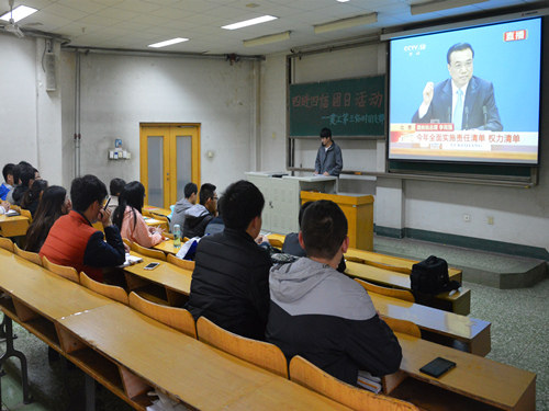 第三团支部临时负责人作为主讲人,对“四进四信”进行了全面的解读,在如何更好地实现“进支部、进社团、进网络、进团课”上,提出了自己的见解。并提出,该团支部之后的活动设想,在重要节日以及两会召开等时间节点,围绕学习贯彻讲话精神,开展线上、线下相结合的相关活动,利用新媒体平台,实现学习宣传讲话精神的日常化。同时鼓励大家,充分利用网络平台,关注时事热点,增强自身责任意识。之后,大家一起观看“国务院总理李克强答记者问全过程”的视频。观看完视频之后,大家就“中国公民海外购房”、“电子商务等新业态”、“缅甸边境”问题进行了一番探讨,同学们无所不言,踊跃上台讲说自己的认识与见解,讨论场面十分激烈。主题活动在主讲人的总结发言中结束,他鼓励大家在活动之外、生活之中关注两会热点,充分学习两会精神。
