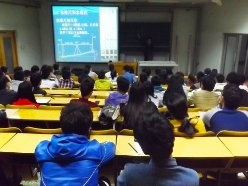 晚上7时许,205教室里已坐满参赛员工,等待专业教师讲解。王殷行开门见山,把测量原理,测量方法详细展现在员工眼前。随着王殷行的细心讲解,四等水准测量知识顺着声音留在员工脑海里。单纯的理论讲解显得呆板,理论实践同行才有更大收效。之后王殷行结合测量仪器对测量过程中的具体问题进行说明,员工们仔细听,认真记。测量表格填写方式、仪器使用方法、数据处理流程等测量知识的声音和图片,在教室里传播。大一培训结束,王殷行匆匆赶至105教室,进行大二培训。讲述内容集中在难点,要求也更为严格。知识改变人生,测量“筑”就理想,每一次的学习都是向理想的前进。
