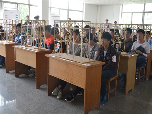 5月7日下午,大赛决赛正式举行,19支优秀队伍携带自己的作品依次上台展示作品,表述独特设计思路,接受不同方面的荷载测试。参赛选手在模型质量、荷重加载、方向偏移等方面各有千秋,体现了同学们思想的缜密,创意的独特,赢得了现场观众的阵阵掌声,整个比赛秩序井然有序。