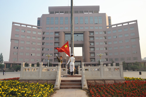 升旗仪式上,在全体师生的注目礼下,英姿飒爽的国旗护卫队护送鲜艳的五星红旗进场,伴随着庄严的中华人民共和国国歌,五星红旗迎着朝阳冉冉升起,迎风飘扬,伴随红旗升起的还有全体师生强烈的民族自尊心以及民族责任感。在场的每一个人向国旗行注目礼,深怀对祖国无限的热爱和崇高的敬意。