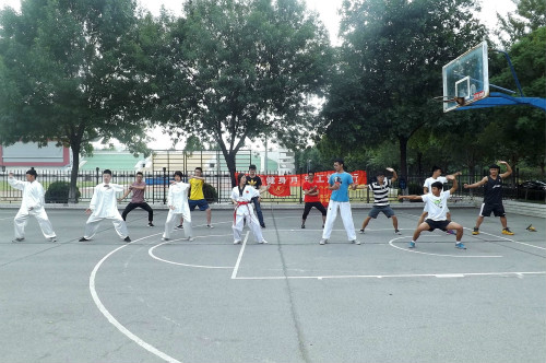 共切磋,同奋勉 。为推动健身运动发展,丰富校园文化生活,6月13日下午,跆风跆拳道协会、太极拳协会、武术协会、双截棍协会在第二体育场进行交流活动。