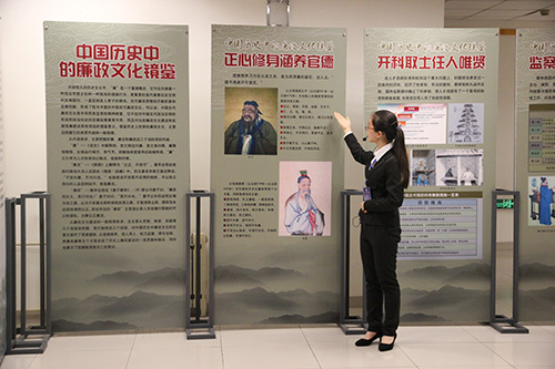 此次展览分为“中国历史中的廉政文化镜鉴,中国共产党的拒腐防变风雨路,警钟长鸣、防微杜渐,当代典范、身边榜样,廉洁修身、从我做起”五个部分,并通过古今结合的方式,以时间为主要线索,从中国古代的廉政文化建设讲起,一直到对中国共产党自成立以来走过的反腐倡廉建设之路的了解与回顾。在首先展览的“中国历史中的文化镜鉴”部分,讲解员通过引用孔子等古代圣贤的名句强调了”正心修身、涵养官德”是每个干部应有的基本素养,并依次介绍中国古代各朝代反腐及选官制度的变迁过程。随后,她向大家进一步讲述中国共产党成立后各不同时期的反腐监察建设情况以及在此期间党的廉政文化建设所取得的成就与影响。接下来的讲解过程中,同学们通过对近几年国家反腐行动中落马官员以及高等教育领域被捕的高层干部的相关贪污腐败案例的了解,认识到了”防微杜渐,警钟长鸣”的重要性。紧接着,她向同学们一一介绍在此方面表现突出的共产党员典范和他们的光荣事迹。最后,讲解员重点向同学们讲述党和国家在治理腐败方面的相关规定与条例,并倡导大家从现在做起,以实际行动养成良好的工作作风。同学们在参观过程中一直认真听取讲解,积极学习其中的道理。