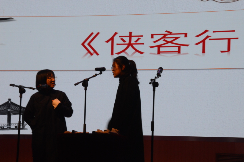 活动开始前半小时,三号报告厅就已基本上坐满了观众,体现出日新曲艺社的受欢迎程度。活动伊始,日新曲艺社团长许新港带领全体日新曲艺社的干事向观众们问好,观众们也积极回应,全场氛围瞬间被点燃。紧接着,由日新曲艺社主持人汇报第一个演出节目。第一个出场演出的是日新曲艺社的大一新生韩泽玉、崔佳铭带来的《铃铛铺》,虽说这两名演员是第一次上台表演,但丝毫不逊于那些老演员,给大家带来了一场精彩的表演,也赢得了观众们的掌声。接下来的节目是张元道与石龙琦带来的《两个情》和仇晓卉与陈雨曦的《侠客行不行》,这几位同样也是大一新生,但没有惧场,将他们最好的一面表现出来,而且仇晓卉与陈雨曦是女生,但巾帼不让须眉,把相声表演表现的淋漓尽致。接下来是由王林炟、穆峥带来的《汾河湾》与钟浩玮、王沛琦带来的《梁祝》,这几个人经验丰富,而且观众们都已熟知,刚上台就引起观众们热情的掌声,他们相声表演是把观众逗的笑的停不下来。最后是由张金欣与张慧敏带来的《学满语》,体现出语言的魅力。其实日新曲艺社还有几个节目,但由于时间原因,表演到此结束。团长许新港带着日新曲艺社的成员一起和观众们告别,并感谢观众们对日新曲艺社的支持与认可。观众们用掌声回应,依依不舍的离场。