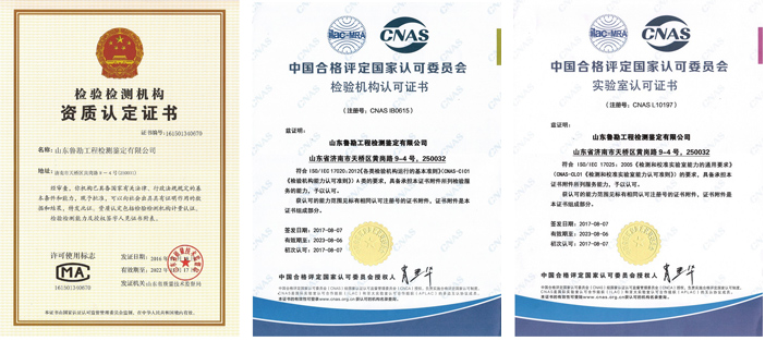 公司于2007年首次取得山东省质量技术监督局颁发的检验检测机构资质认定【CMA】证书;2010年取得山东省建筑工程管理局颁发的建设工程质量检测资质;2012年通过了质量管理、环境管理和职业健康安全管理【QEO】体系认证;2017年进一步取得了中国合格评定国家认可委【CNAS】检验/检查机构认可和实验室认可资质;具备完全独立、客观公正地从事工程质量检测鉴定、质量安全评价和工程技术咨询等业务的资质和技术能力。本机构为中国物业管理协会房屋安全鉴定专业委员会副主任委员单位,具备全国房屋安全鉴定单位资格,致力推动城市房屋安全鉴定的研究和推广。