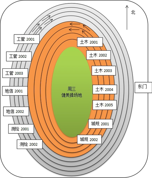 土木2001、土木2002、土木2003、土木2004、土木2005、城规2001、城规2002共7个班级,在体育场东侧直线跑道内四道由北向南依次排列,面向北四列纵队集合,按照逆时针方向进行耐力跑三圈。工管2001、工管2002、工管2003、地信2001、地信2002、 测绘2001、测绘2002共7个班级,在体育场西侧直线跑道外四道由北向南依次排列,面向北四列纵队集合,按照顺时针方向进行耐力跑三圈。各班级集合位置如下图所示。