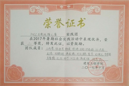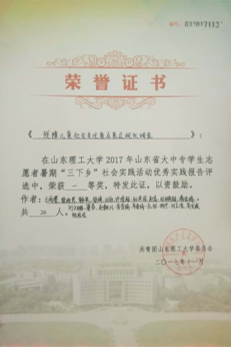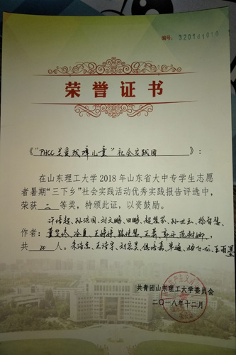 所获荣誉: 2016年省级优秀服务团队、2016年社会实践团队省级一等奖、2016年社会实践团队校级一等奖、2016年社会实践报告校级一等奖、2017年社会实践报告校级一等奖、2018年暑期“三下乡”社会实践活动优秀实践报告二等奖、2018年思政课实践调研报告三等奖、山东理工大学第三届老员工舞蹈大赛三等奖