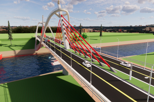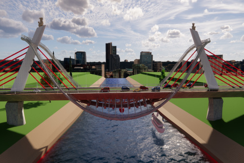 其中一等奖作品《映叶桥》,其设计理念来源于孟浩然的《宿桐庐江寄广陵旧游》——“风鸣两岸叶,月照一孤舟”。桥梁整体形状如一片叶子倚靠在孤舟上,是一座主跨175米预应力混凝土双塔双索面斜拉桥,同时在斜拉桥的整体机构上增设附属结构,使桥梁兼具观景与通行的功能。组内成员积极沟通,相互合作,历时18天完成了此作品。