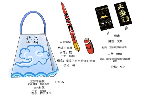 此次活动共有六个可选主题,即“百年征程”红色主题、“京华神韵”特色主题、“文脉传承”公园文化主题、“激情冬奥”冰雪主题、“文博之光”文创主题、“品牌跨界联名”主题。参赛选手们须在满足主题的条件下,设计出具有北京旅游特色的文创产品。比赛期间,同学们积极查询资料,学习北京文化,在保证产品实用性的同时,设计出了大量美观又不失内涵的“北京礼物”。其中,作品“京味文化”共包含有三样小商品:以“祥云瑞气”为主题的云梦手提袋,添加了京剧脸谱的元素的钢笔,绘制有天安门轮廓的橡皮。最终,此作品凭借首都文化的深入展现从众多文创产品中脱颖而出,获得了此次比赛的一等奖。