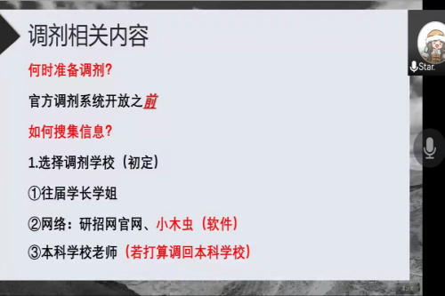 会上,张威首先详细讲解了复试内容、如何准备复试、如何联系导师、个人展示等相关知识和经验,一一为同学们分析专业课、英语、复试自由提问等环节常遇到的问题以及解决策略。其次,在调剂相关内容方面,张威向同学们介绍了近几年调剂情况,同时强调了调剂过程中的注意事项。张威表示,考研调剂非常考验同学们的耐心,希望同学们在有限的时间内开拓信息源,收集更多调剂信息,互相分享。在考研形式愈发严峻以及就业难的背景下,一定抓住机会调剂,缘自己的研究生梦。最后,张威简单分享了研究生的生活学习与后续发展,为考研学生指明学习方向。同时,张威不断强调要以良好的心态去对待复试、调剂,相信勤能补拙。随后,同学们踊跃提问,张威依次给予解答。