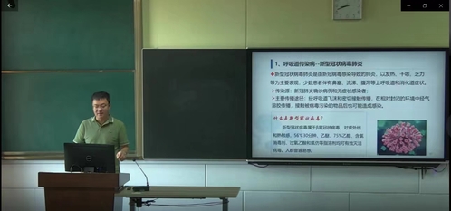 汪洋主持进行传染病、疫情防控两方面的授课。他从肺结核、艾滋病等较严重的传染型疾病展开讲述。他表示,无论是哪一类的传染病,我们都要掌握传染病控制的基本原则,根本是要管理和控制传染源,关键是要切断传播途径,重点是要保护易感人群。汪洋重点讲述了近几年肆虐的新冠病毒和基本无法治愈的艾滋病,嘱咐同学们要注重个人卫生,尽量减少出行,严格遵守防疫要求。