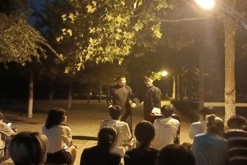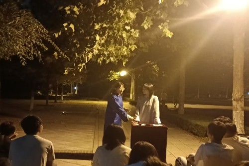 此次路演活动以《白蛇传》作为开端,作品生动曲折的情节以及社团成员们精湛的表演吸引了一大批观众驻足围观。随后,社团成员们相继上场表演,一个个精彩的相声节目接连上演,“包袱”不断、笑料百出,让同学们近距离感受到了传统曲艺的独特魅力,向大家呈现了一场精彩的曲艺盛宴。在表演过程中,社团成员们通过搞笑幽默的语言和肢体动作以及搭档之间的熟练配合展现出了各自扎实的基本功,现场每隔不到30秒就会听到一阵笑声,台上演员说得起劲儿,台下观众听得带劲儿,路演的气氛逐渐被推向高潮。而《戏说家信》和《智取威虎山》的轮番精彩演出更是使得现场观众都拍手称赞。演出最后,哲学思辨类相声《五红图》的精彩演绎为路演做了完美的收官。演出结束后,日新曲艺社的成员们对观众们的到来表示感谢,并诚邀新生们积极加入社团。