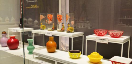 世界琉璃看中国,中国琉璃看淄博,最后来到精耀厅对面的新辉厅。淄博作为著名的“琉璃之乡”,鸡油黄、鸡肝石、内画鼻烟壶、灯工琉璃等一系列琉璃名品从这里走向世界,琉璃已然成为淄博这座城市响当当的名片。中国陶瓷琉璃馆新辉厅琳琅满目的琉璃展品,诉说着建国后淄博琉璃的涅槃发展之路。