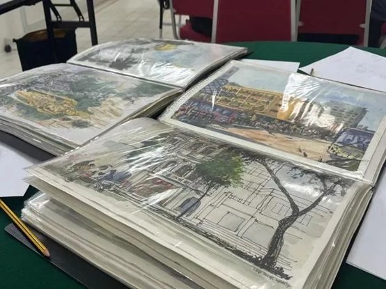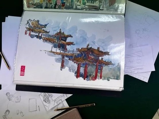 在我们认真绘制校园素描的时候,老师也给我们画了一幅素描画,这幅画最左边的那个人就是当时低头绘制素描的我。随后我们观摩了老师的画作,老师的画作的取景遍布世界各地,其中我最喜欢的就是这幅天后宫的画作,应该是后天我们将前往天后宫进行参观,实地的看一下天后宫是什么样子,学习当地的文化历史。