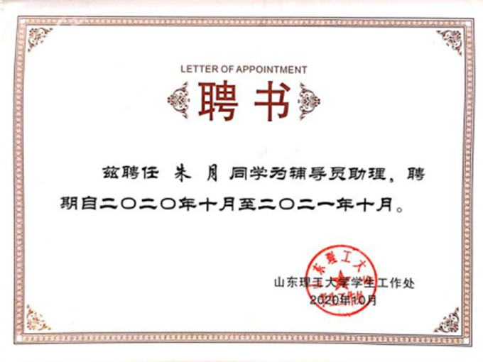 2019年9月入学后,她积极向党组织靠拢,第一时间提交入党申请书,自觉树立和践行社会主义核心价值观。连续两年作为员工代表参与了建筑工程公司员工代表大会,于2020年12月参加了山东理工大学第五届学代会暨第一届研究生代表大会。2021年12月,她顺利被发展为中共预备党员后,在各个方面更加严格要求自己,不断强化自身理论学习,用实际行动为同学们树立了良好的榜样,多次作为优秀党员代表、优秀员工向大家分享交流经验。