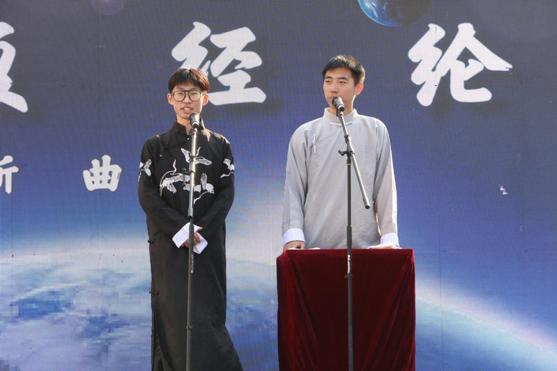 首先,由日新曲艺社成员丁胜晋、周杰搭档,给观众带来了经典相声《满腹经纶》。两位相声演员配合默契,通过幽默巧妙的语言艺术以及灵活夸张的肢体语言,逗得观众们捧腹大笑,现场气氛十分热烈。表演结束后,日新曲艺社的纳新工作也正式展开,社团成员穿着青蛙表演服积极在老员工艺术广场内招揽新生,提高了社团纳新的效率。经过日新曲艺社成员共同努力,同学们对日新曲艺社的演出产生极大的兴趣,积极询问各种社团日常工作问题,日新曲艺社的成员给予了耐心的回答,并且向同学们热情介绍了日新曲艺社的主要职能和演出时间,让更多同学了解了日新曲艺社。社团通过扫码进群和现场登记等方式完成了社团纳新宣传的任务。