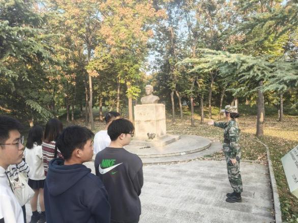 随后,同学们在引导员的带领下依次参观了将军和英模专题展区,军事素质拓展训练场,知识报国展区,征兵政策展区等。最引人注目的是先进武器装备和大国利剑主体,园区内歼6战机、高射炮、大型仿真模型山东舰、淄博舰、长征五号运载火箭模型等陈列其中,通过实物的展示,让同学们更加真实地感受到我国在国防军事方面的发展成就。在冯思广纪念雕塑前,大家共同回顾了冯思广烈士的英勇事迹,学习冯思广热爱祖国、忠于人民、勇于担当、甘于奉献的宝贵品质,向其致敬。同学们在冯思广雕塑前默哀悼念,深切表达对冯思广烈士的无限追思。最后,在入团誓词石碑前,引导员带领同学们进行誓词宣读,增强对党的归属感和认同感。