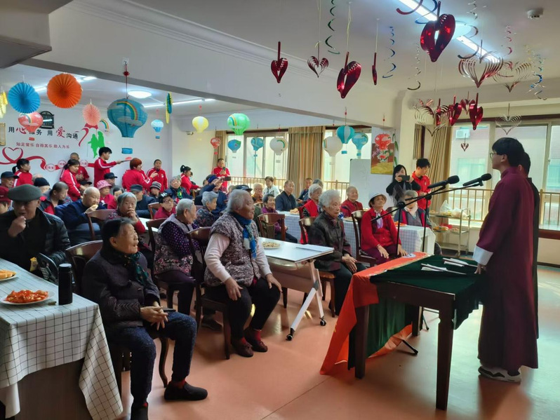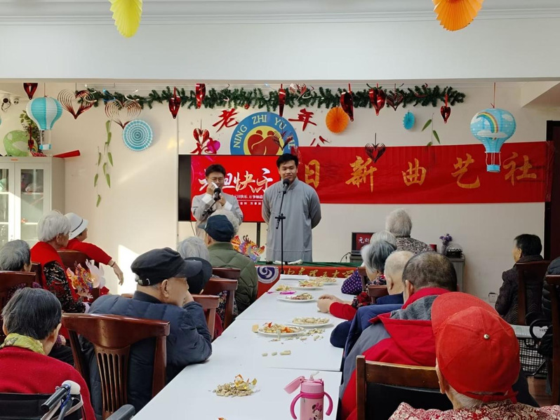 活动伊始,日新曲艺社成员向现场老人送上节日的问候和祝福。此次演出在王万松带来的开场板中拉开帷幕,打竹板时有序的节奏吸引了老人们的注意,令人忍不住叫好。接着连昕和胡轩玮带来的相声《铁甲将军》,表演者情绪到位,演出精彩动人,活跃了现场的气氛。然后日新曲艺社成员和老人们合唱的《新年快乐》,歌声欢乐动人,现场气氛一片祥和。赵林博和谢宇健带来的经典相声《白蛇传》,表演者台词功底扎实,讲述了许仙和白娘子的故事,故事情节曲折动人,收获了老人们的一致好评,将现场气氛推向了高潮。最后陈昭然和马宝坤带来的经典相声《智取威虎山》,两人配合默契,全程笑点密集,现场一片欢声笑语。此次活动也在现场欢快的氛围中落下帷幕。