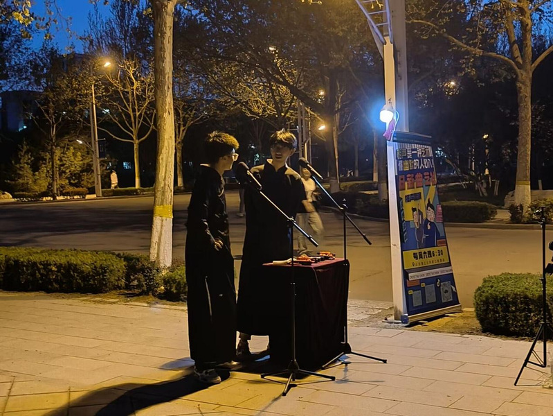 首先,社团负责人周杰向前来观看演出的同学致以热烈欢迎,并宣布演出正式开始。此次路演活动以徐志鹏、韩祺带来的相声《栓娃娃》拉开帷幕,社团成员与现场同学进行互动,并拿出提前准备的零食和扇子等礼品,初步调动起观众的情绪。接着,曹子怡和崔东梅带来的经典相声《相面》,两人通过幽默诙谐的语言与生动形象的表演,将生活中的点滴趣事与人生哲理娓娓道来,引起现场观众共鸣与欢笑。然后,相声《车在囧途》和《三节拜花巷》,表演者形神具备,两人一来一回,配合默契,引得现场观众捧腹大笑,许多观众拿出手机拍照,将活动气氛被推向高潮。最后,杨依超和陈昭燃带来的经典相声《羊上树》,两位演员以搞笑幽默的语言和丰富的肢体动作,将故事生动形象的展现给观众,包袱衔接自然,为此次路演活动勾勒出完美句号。