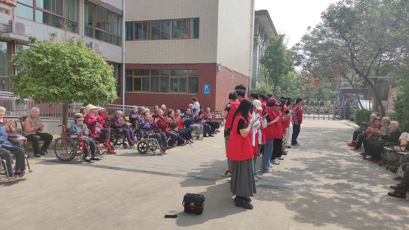 活动伊始,志愿者们手持工具,穿着统一的志愿者服装,前往石村老年公寓。志愿者们分工协作,有的拔除杂草,有的清理园区的花坛和小径,让每一寸土地都干净整洁。每一个动作都显露着志愿者们的细心。志愿者们以实际行动践行着社会责任,为老年公寓的环境整治和老人们的生活增添了一抹亮色。随后,志愿者们共同为老人们演唱了歌曲《歌唱祖国》,活动中的另一亮点是老人们的精彩表演,他们熟练地演绎了《上春山》手势舞。最后,在愉快的氛围中,志愿者们与老人们进行了亲切交流并给予了老人们温暖的回应。