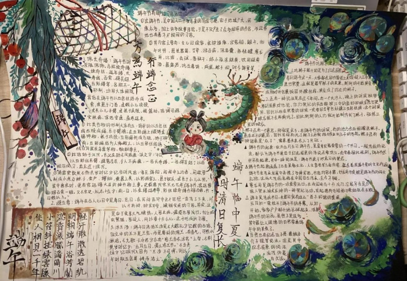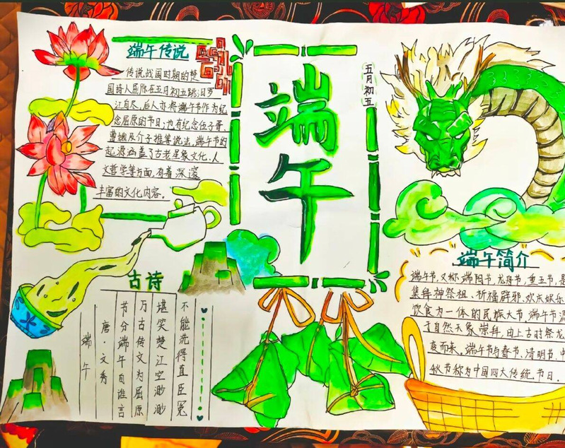 活动伊始,同学们围绕端午节的主题展开创作。他们利用课余时间,通过查阅资料、互相讨论等方式,深入了解端午节的来历、习俗以及背后的感人故事。在此基础上,同学们运用自己的聪明才智,将所学知识融入到手抄报设计中,呈现出丰富多彩的视觉效果。在同学们的巧手绘制下,一幅幅精美的手抄报作品应运而生。有的同学以龙舟竞渡为主题,用鲜艳的色彩和生动的画面展现了端午佳节的热闹氛围;有的同学则将屈原投江、粽子飘香等元素融入设计中,让人感受到端午节的独特魅力。此外,还有的同学创新性地将现代元素与传统节日相结合,展现了端午节与时俱进的一面。