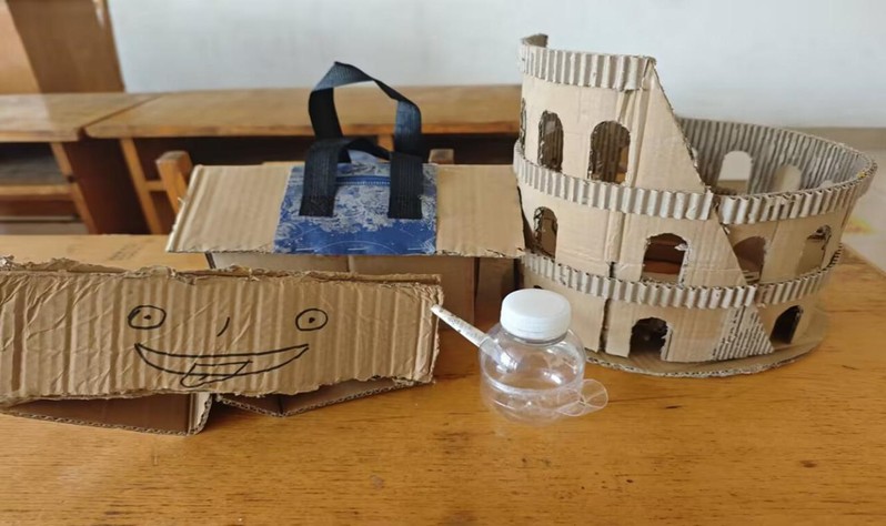 此次大赛吸引了许多喜爱创新设计的同学们组队报名参加,共有30人,10个小组。大赛鼓励同学们运用可循环利用的材料创作作品。参赛者在材料选择和主题构思上享有完全的自由度,尽情展现个人才华,诞生了许多优秀作品。灵感源自意大利首都罗马市台伯河东岸的古罗马斗兽场。通过巧妙地裁剪废弃快递纸盒,勾勒出建筑的轮廓,并利用瓦楞纸的内部结构作为楼层的腰线,创作出一个既生动又有趣的作品。小房子是奶茶包装袋与废弃的快递纸盒的巧妙结合,打造出了一座专属于小仓鼠的“豪华公寓”。这个小屋不仅配备了简易的门和窗,还附有坚固的提手,使其成为了一个“移动式住宅”,让小仓鼠能够轻松实现随时随地的搬家梦想。