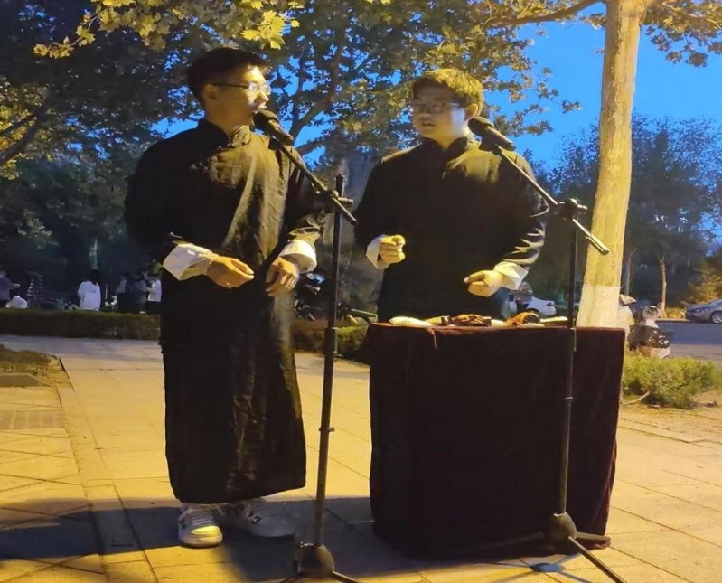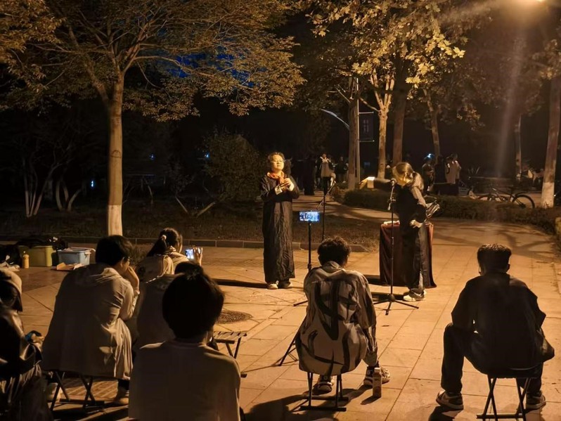 随着灯光亮起,日新曲艺社的演员们身着传统长衫,精神抖擞地登上舞台。开场节目由王荣杰和董浩淼带来《大学毕业》迅速点燃现场气氛,演员们以生活趣事为切入点,用诙谐幽默的语言、生动形象的表演,引得观众笑声不断,掌声如潮。随后,由演员张金洋和连盺带来的《卖吊票》在说学逗唱之间让观众在欢笑中领略到了传统相声艺术的魅力。而高晨和孙邵康带来的《诗词大会》以及曹子怡和崔冬梅带来的《儿童相声》则紧密结合当下年轻人的生活,从网络热梗到校园趣事,以新颖的视角和独特的创意,引发了观众的强烈共鸣。最后是由连盺和陈昭燃带来的相声曲目《人鬼情未了》新颖的改编和演员出色的表演让观众深陷其中。