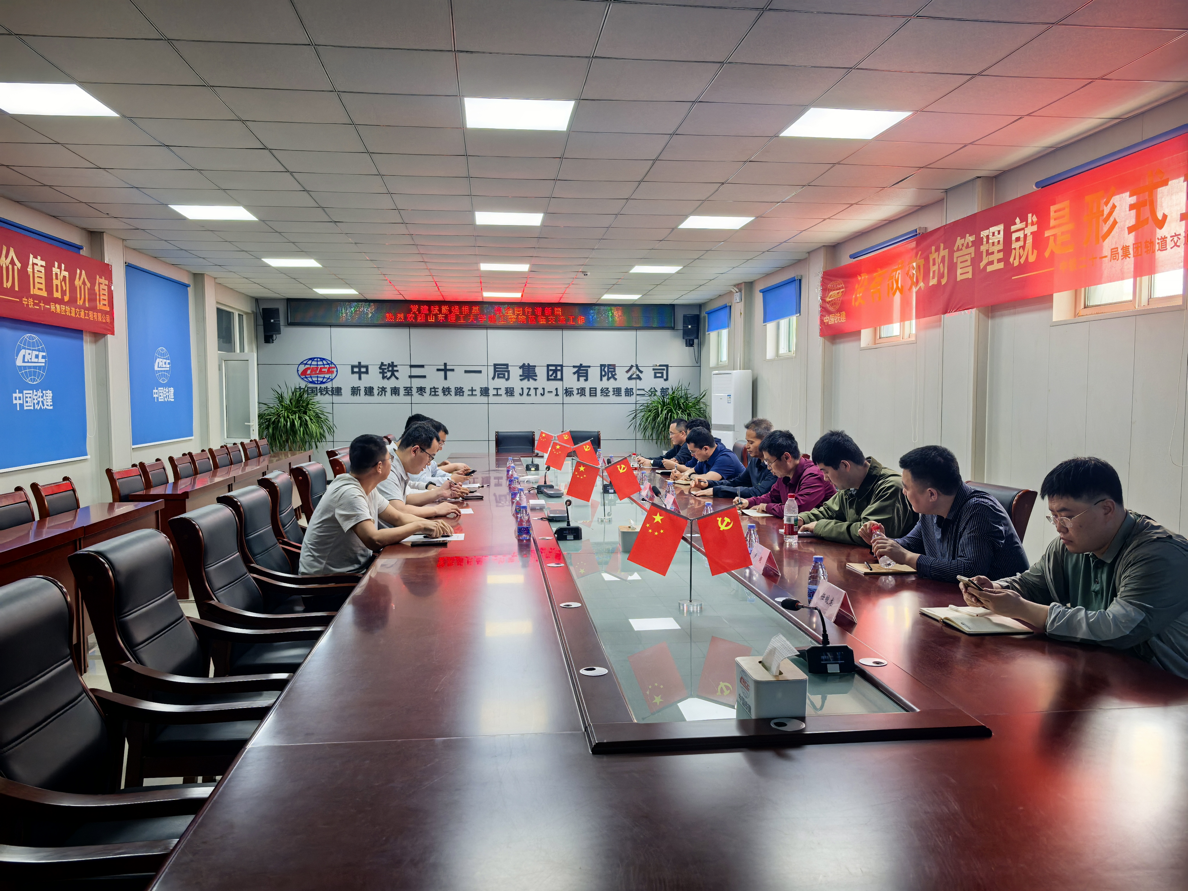 现场参观结束后,校企双方在济枣高铁一标二分部党员活动室开展座谈交流。双方围绕党建共建、人才培养、科研合作、实践教学等方面展开讨论,为后续的深度合作奠定了坚实基础。